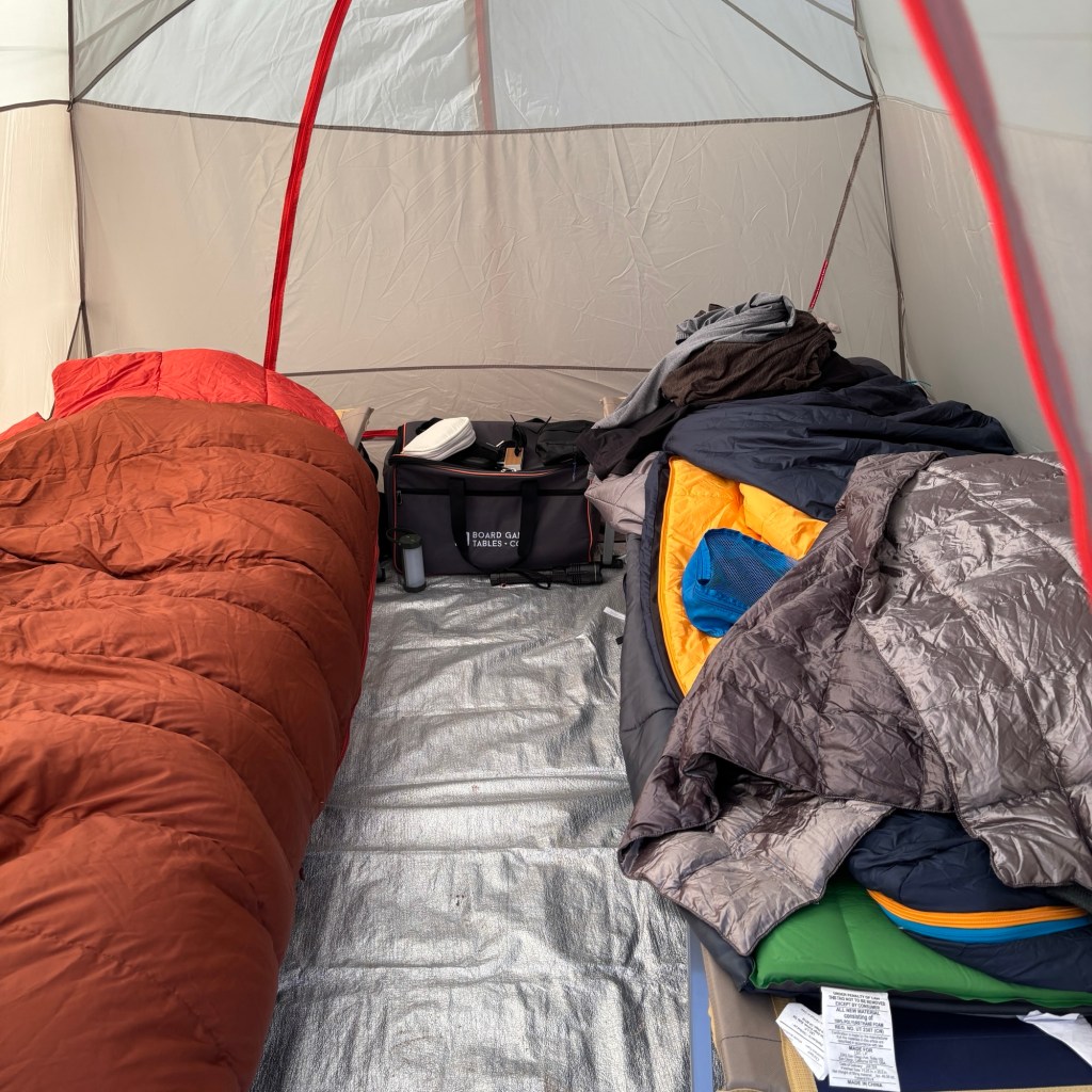 Our new tent is Big Agnes brand and the ceiling is very tall, so Laine christened it St Agnes Cathedral 😂
